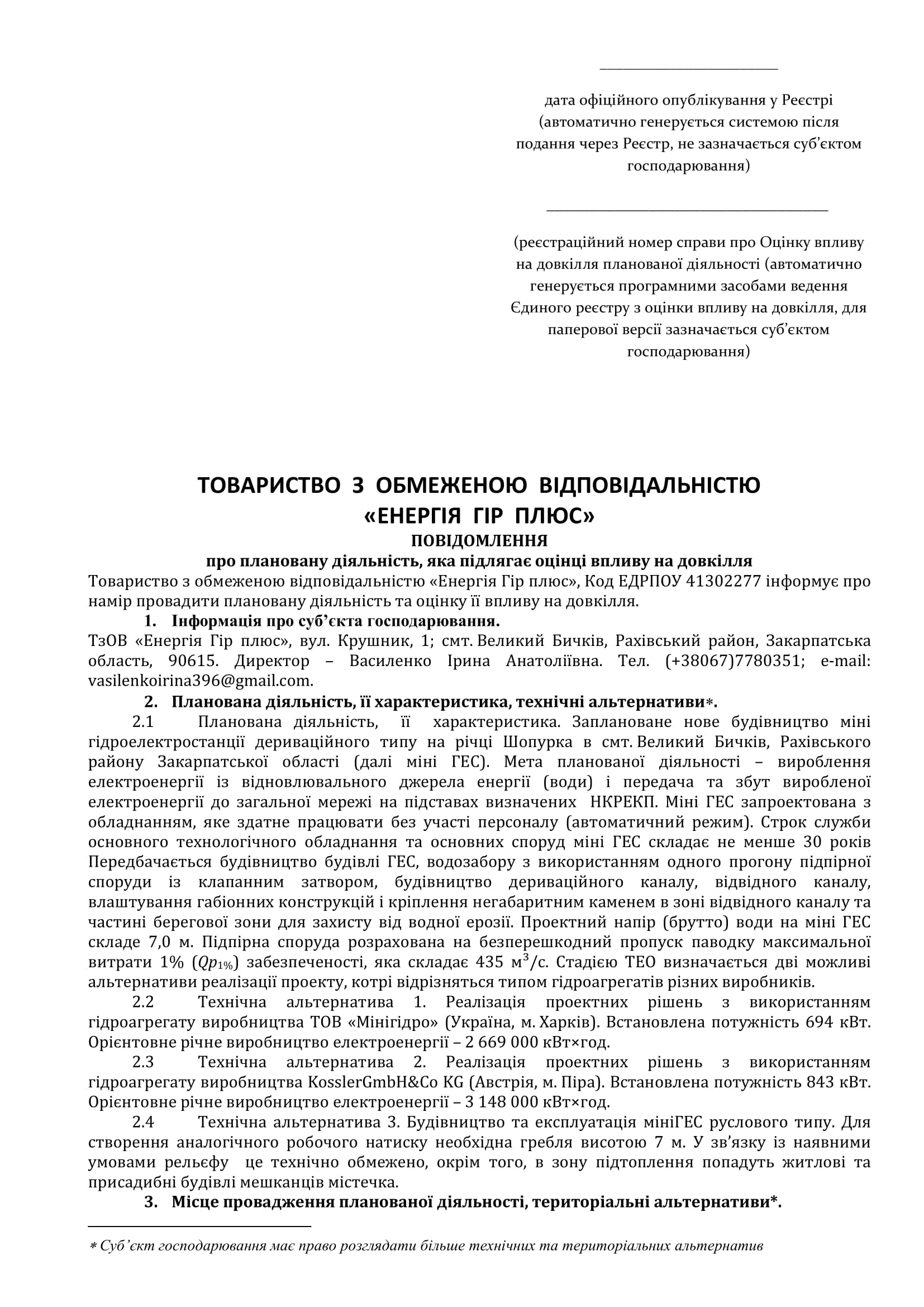 Товариство з обмеженою відповідальністю «Енергія Гір плюс», Код ЕДРПОУ 41302277 інформує про