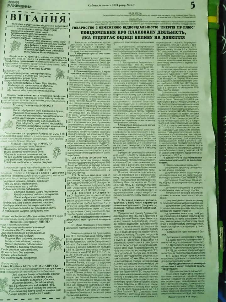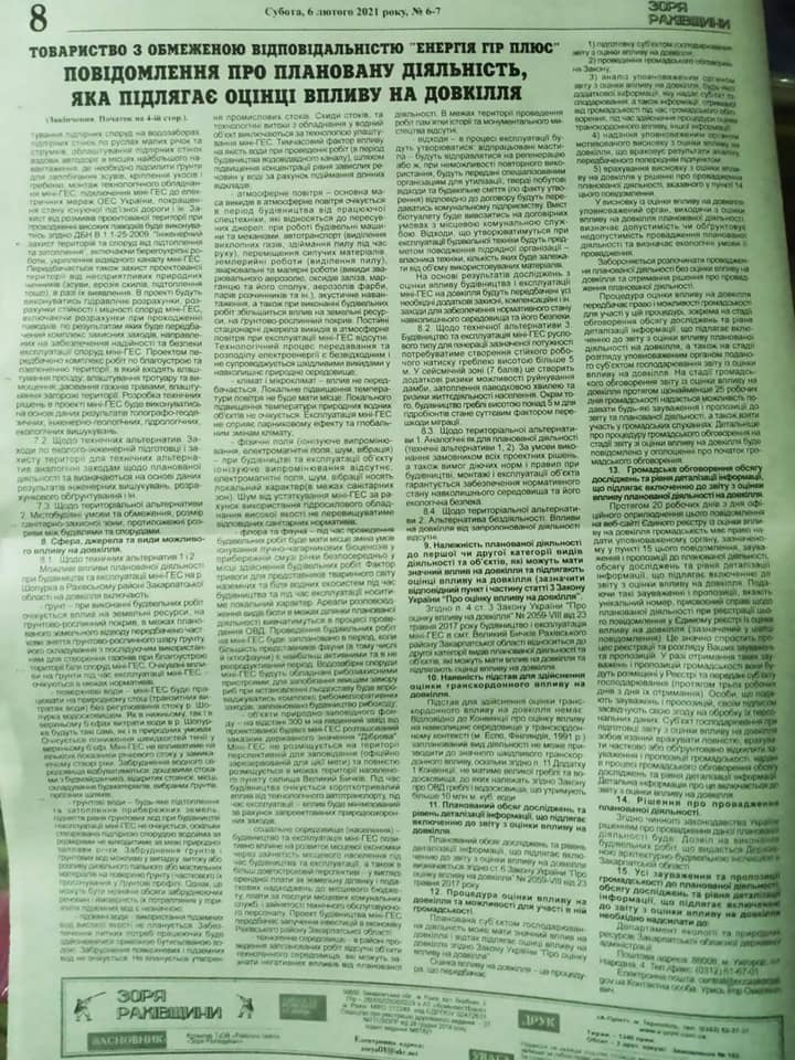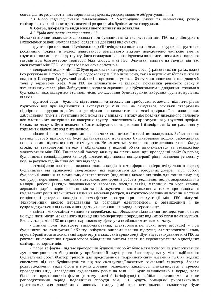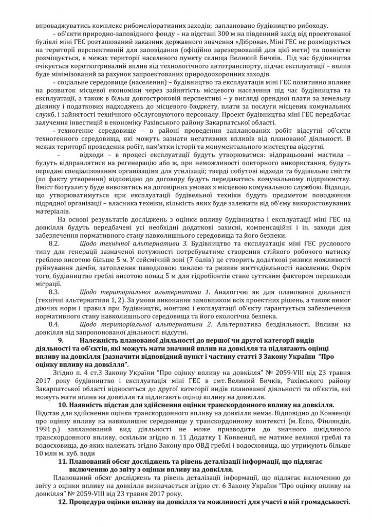 району Закарпатської області (далі міні ГЕС). Мета планованої діяльності – вироблення